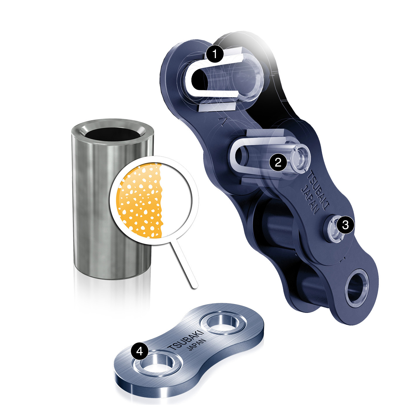 1. Mikroskopijne pory w powierzchni tulei wypełnione są olejem zapewniając doskonałe smarowanie w trakcie pracy wydłużając o 50% żywotność łańcucha.